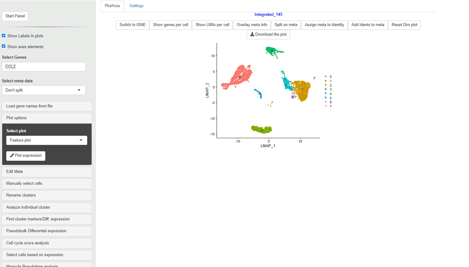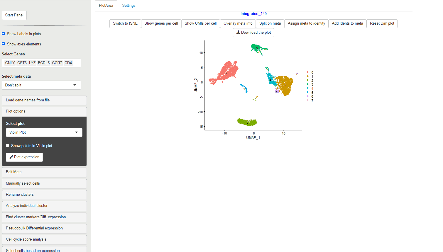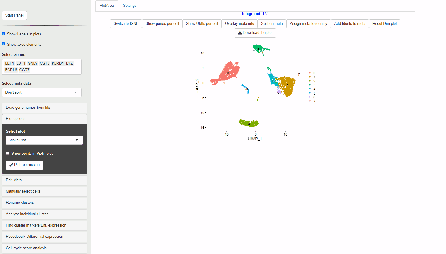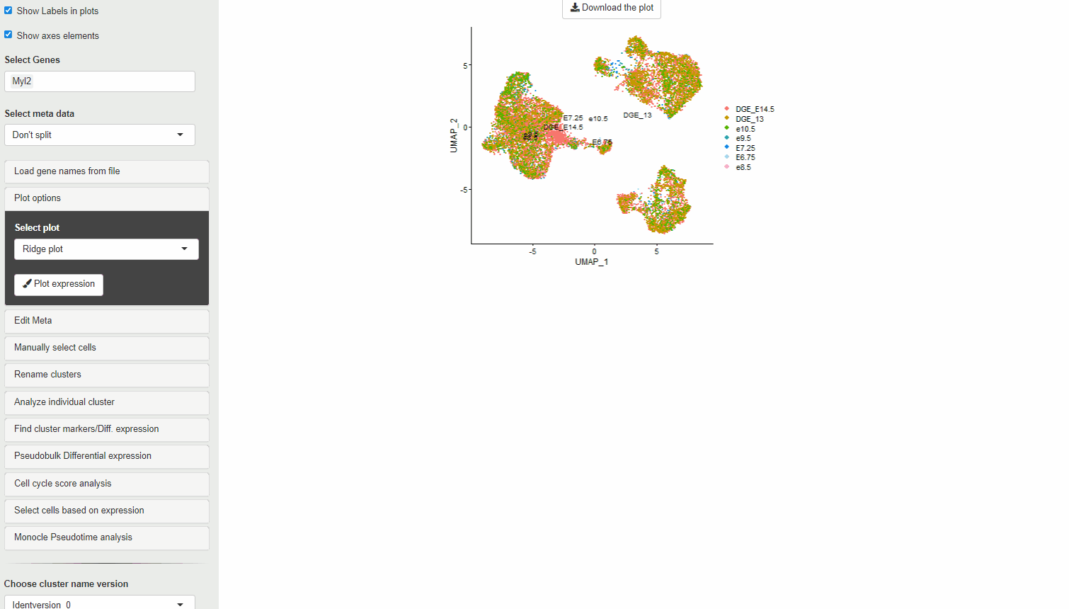 Many journals require βSource dataβ for plots used in figures. To meet this requirement, the source data for each of the plots (expression values vs points/clusters) can be downloaded using the Plot Source data button. This data can be also used to perform statitcal tests and analysis on the plot data.