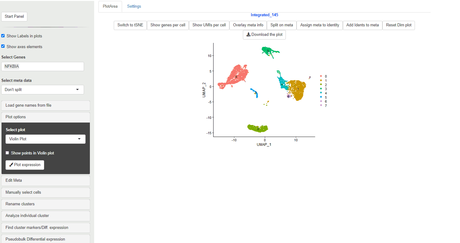 The expression of the selected genes (see Enter gene names to visualize ) can be visualized in Ryabhatta using the following plotting options: